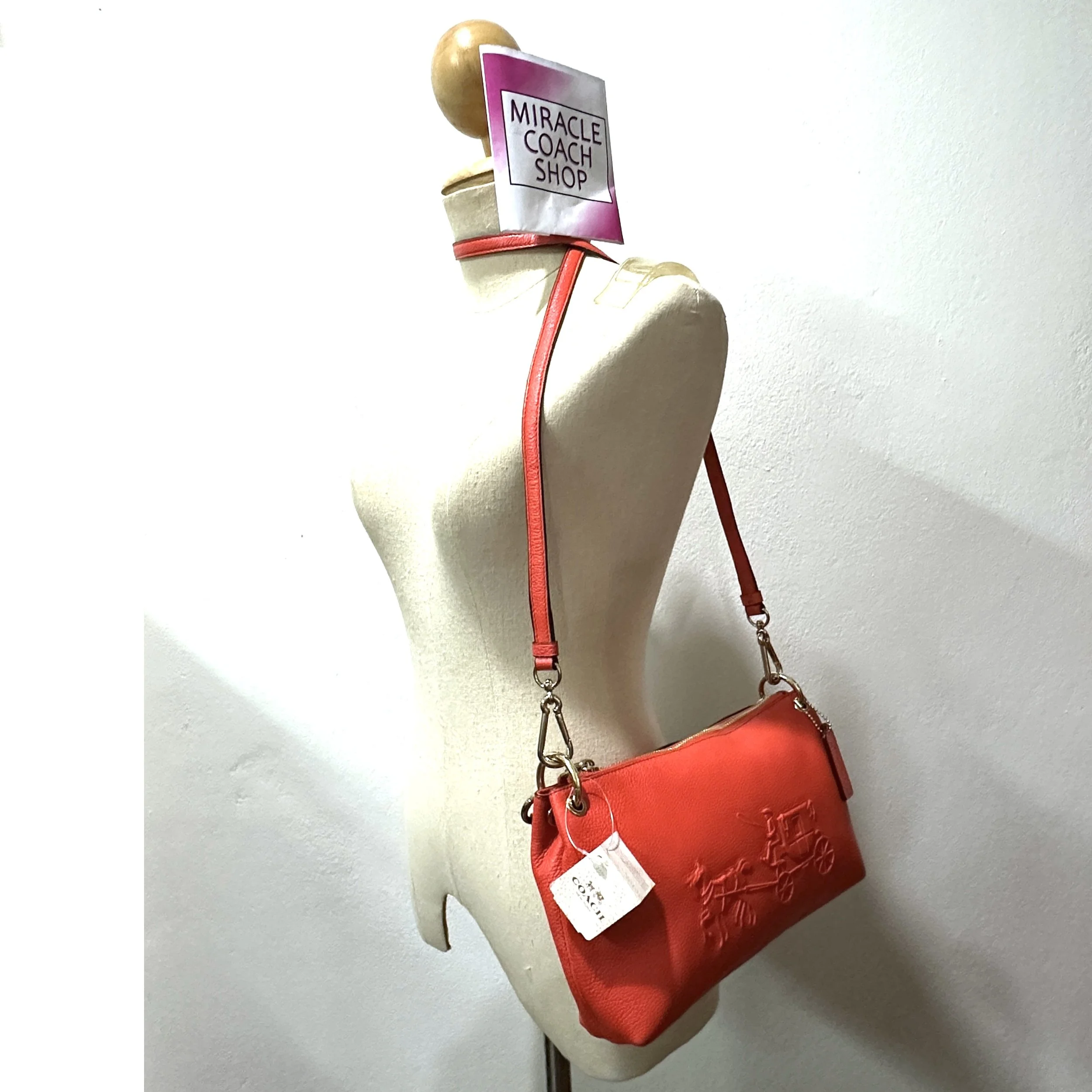 กระเป๋าถือ COACH แท้ หนังแท้ หนังนิ่ม ลายรถม้า Coach สีสวย มีสายยาว COACH 33521 EMBOSSED HORSE AND CARRIAGE CHARLEY CROSSBODY IN PEBBLE LEATHER Coral สีส้ม